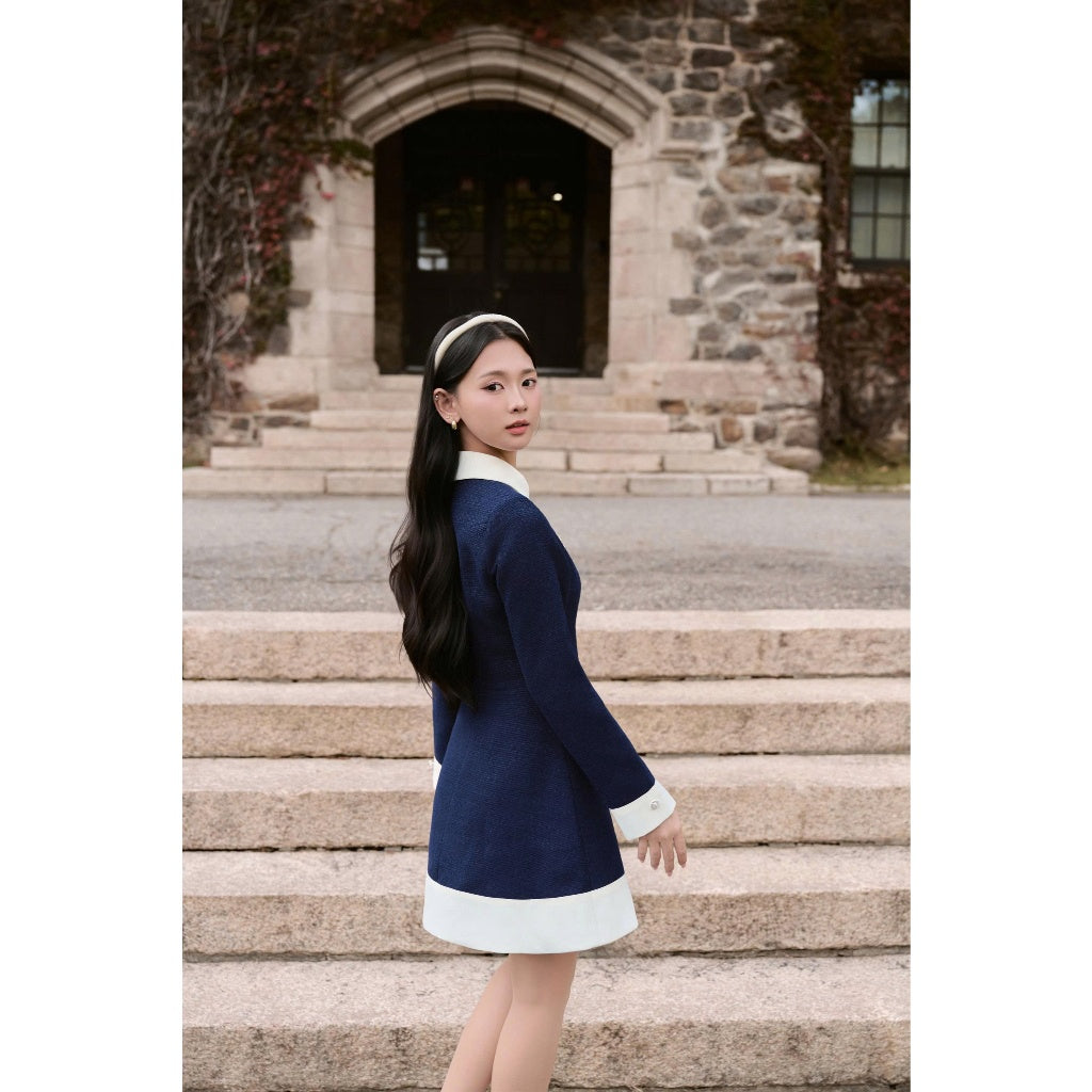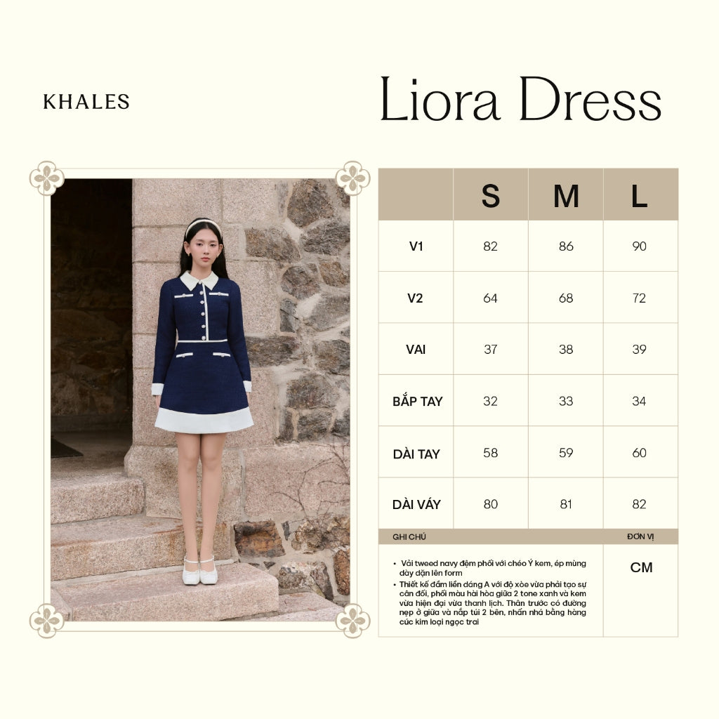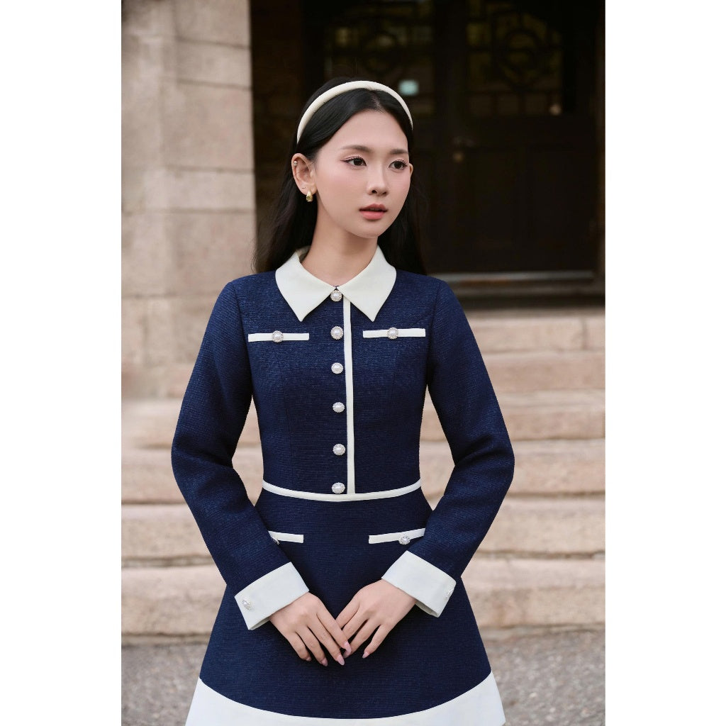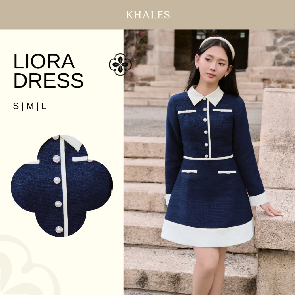 The Liora Dress by Khales is a beautifully structured, long-sleeve A-line dress crafted from premium navy tweed fabric, lined with Italian cream twill for excellent form and comfort. The design features a balanced, moderately flared A-line cut and a harmonious navy and cream color block aesthetic that is both modern and timelessly elegant. Distinctive details include a refined central seam on the front body and two decorative flap pockets accentuated by luxurious gold-tone metal buttons, elevating this piece for sophisticated work and elevated casual settings.