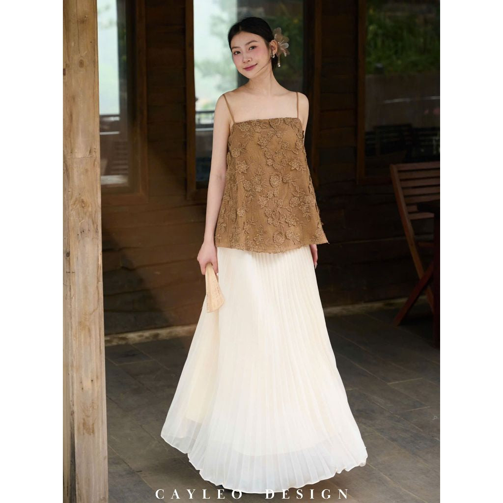 The Dan Ha Mix Set from CayLeo Design captures the essence of feminine grace through delicate textures and balanced design. The floral lace cami top adds a romantic touch, while the flowy pleated maxi skirt creates soft movement and elegant flow. Lightweight and comfortable, this set is perfect for café dates, weekend strolls, or photoshoots in the sunlight.