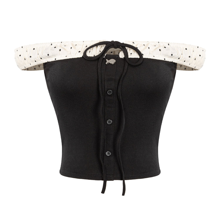 Black base with cream-toned elastic shoulders – chic yet childlike