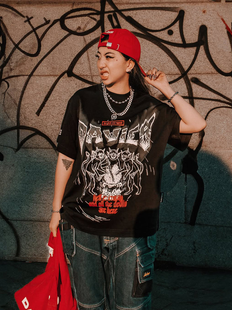 The Tee Hell from Davies delivers a bold yet minimalist streetwear style. Featuring symbolic mascot artwork with the message “Dare to begin,” this tee combines standout design with versatile mix-and-match potential. Crafted from breathable cotton, it ensures comfort and durability for daily wear.