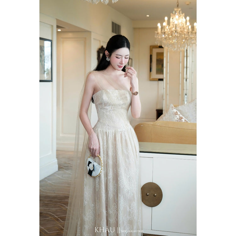 The Nude Lace Gown by KHAU Design captures refined femininity and modern elegance. Crafted with delicate nude lace and a soft mesh overlay, this long evening gown flatters the figure while exuding sophistication. Its slim-fit bodice, flowing skirt, and subtle shimmer make it ideal for formal events, galas, or weddings.