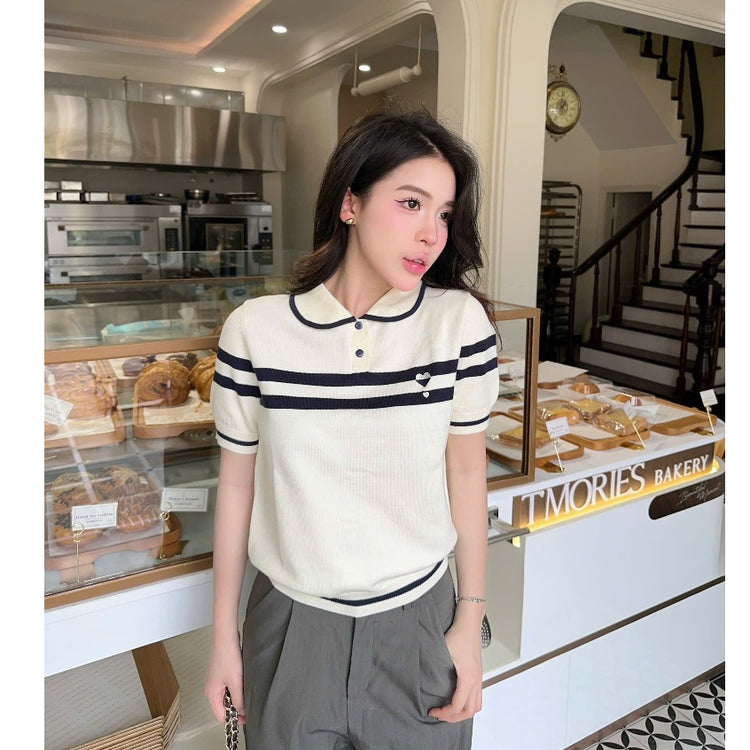 The Princess Polo by DELIZ blends sophistication and comfort in one chic design. Crafted from soft, breathable knit fabric, it features a Peter Pan collar, embroidered heart detail, and classic stripe accents for a timeless, youthful look. This short-sleeve polo knit top adds a touch of refinement to any outfit — perfect for pairing with skirts, trousers, or jeans.