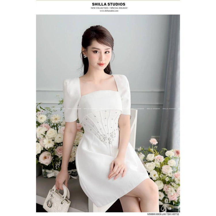The Shilla White Embellished Dress is a premium designer piece crafted with refined structure and luxurious detailing. Designed in a pristine white tone, the dress features hand-applied embellishments that add elegant shine and dimension without overpowering the silhouette.
