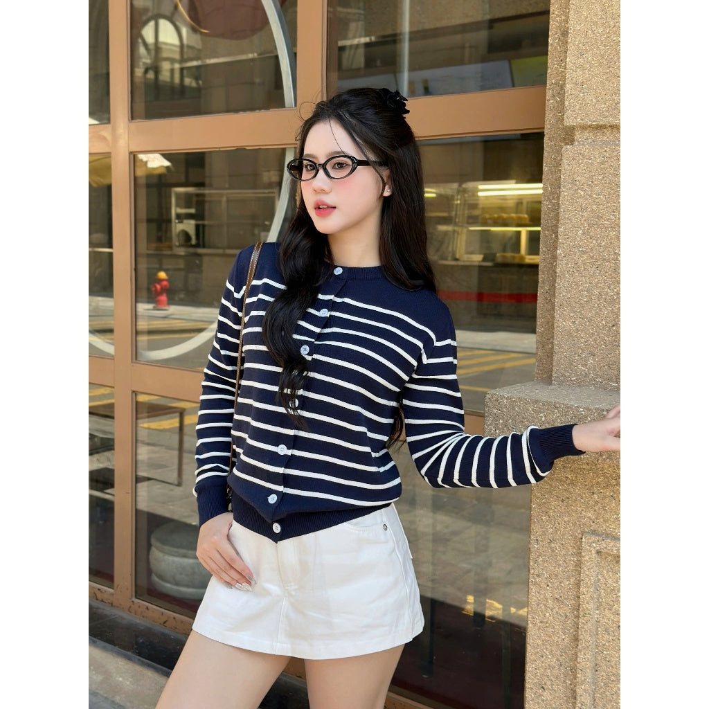 The Soft Knit Basic Cardigan offers a cozy yet lightweight layer for any season. Made from a thin rabbit-wool blend, this short-fit cardigan provides warmth without heaviness. Its round neckline, striped pattern, and minimalist design make it easy to style with skirts, jeans, or dresses — perfect for casual days or office wear.