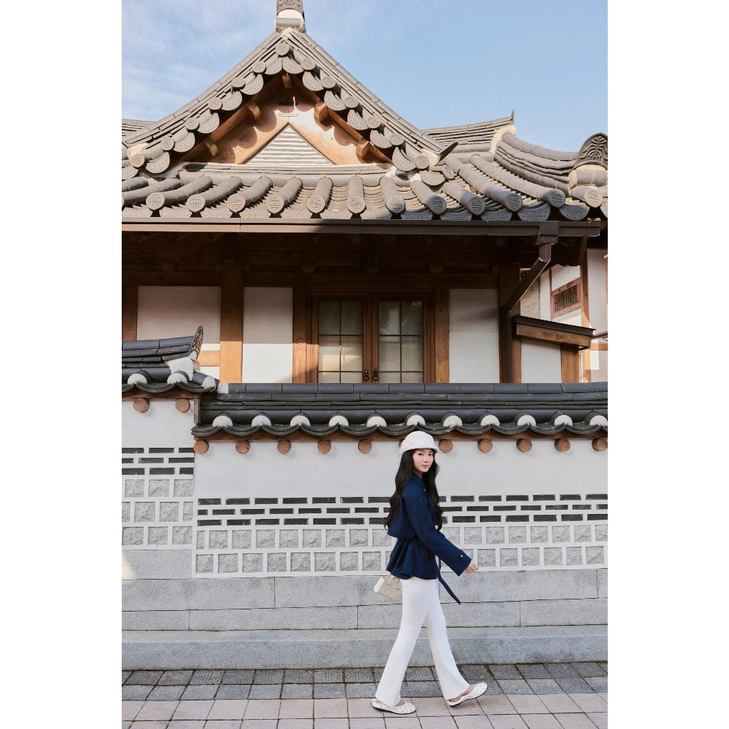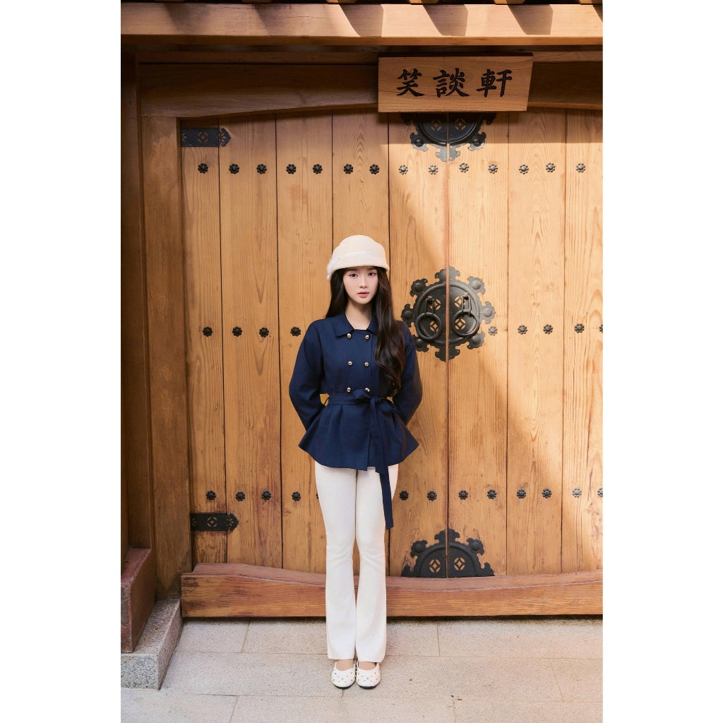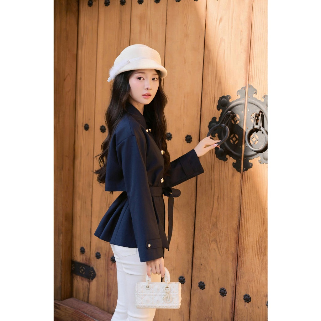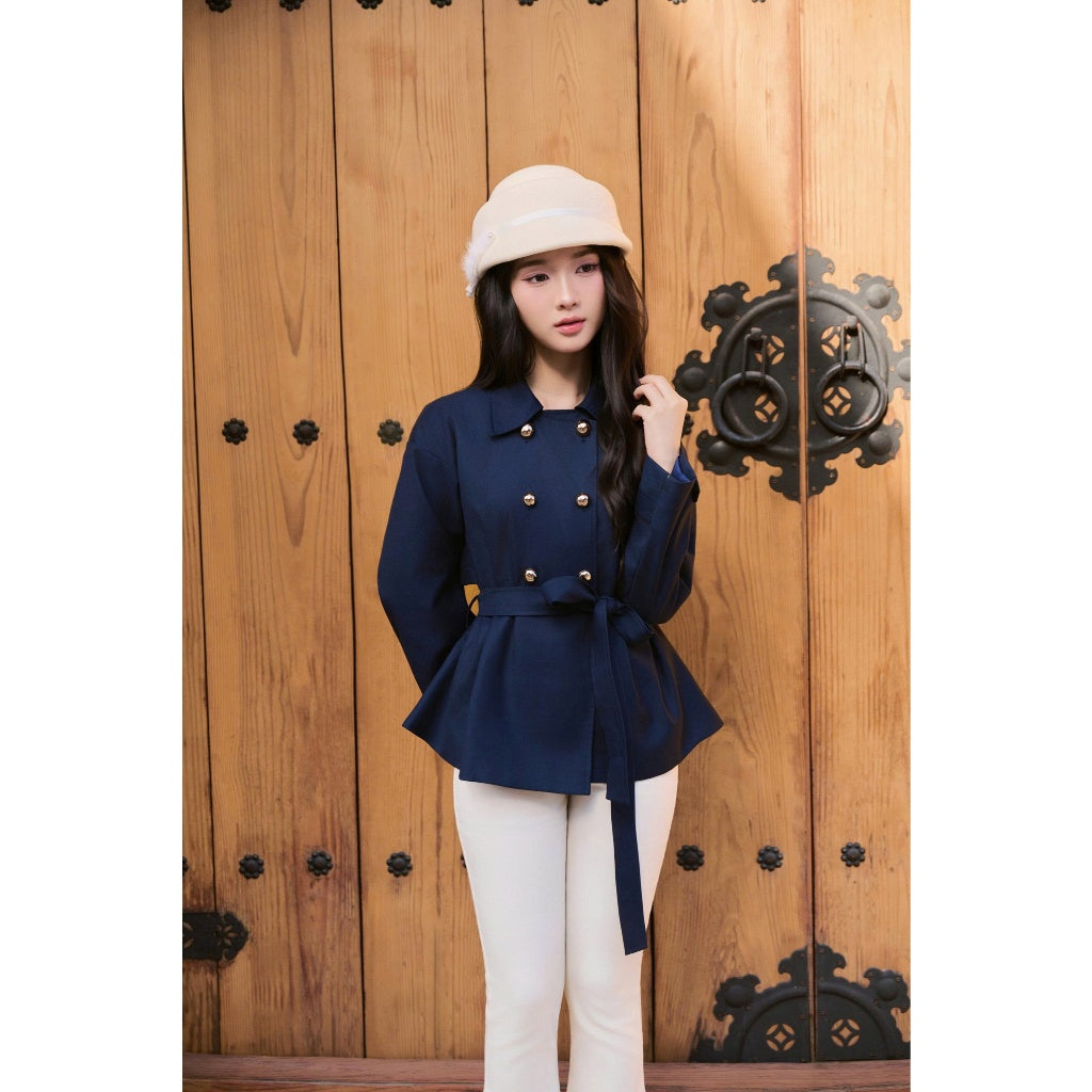 The Juri Jacket by Khales is a short trench-style jacket designed in a rich navy tone and crafted from thick Japanese twill for a clean, structured silhouette. The double gold-button detail adds a refined touch, while the matching waist belt allows easy adjustment to enhance the shape. This jacket blends modern elegance with practicality, making it suitable for work, daily wear, or elevated casual outfits.